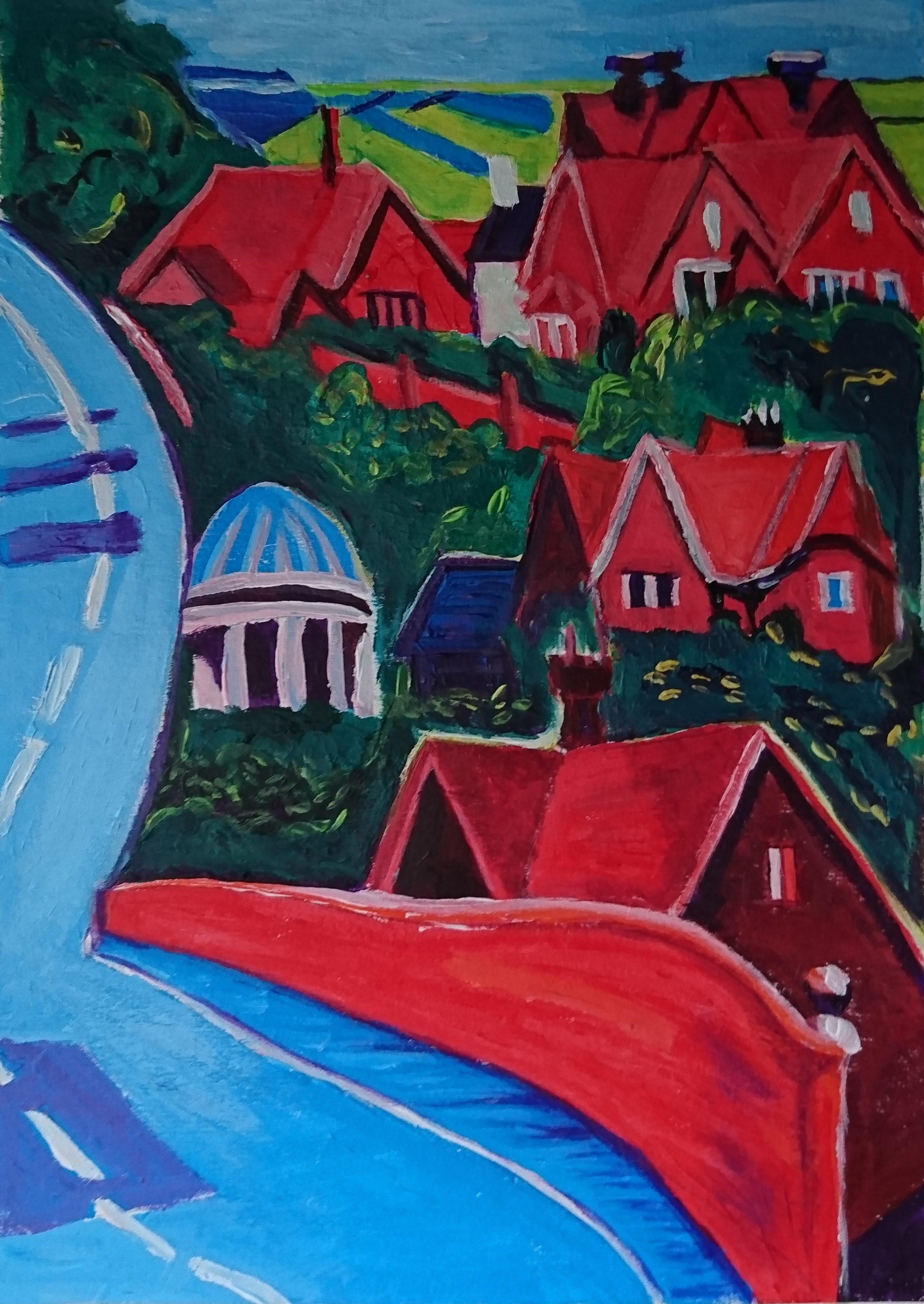 La Route bleue bordée de maisons rouge, une oeuvre de l’artiste d’art contemporain PS1, d’après une inspiration de David Hockney.
